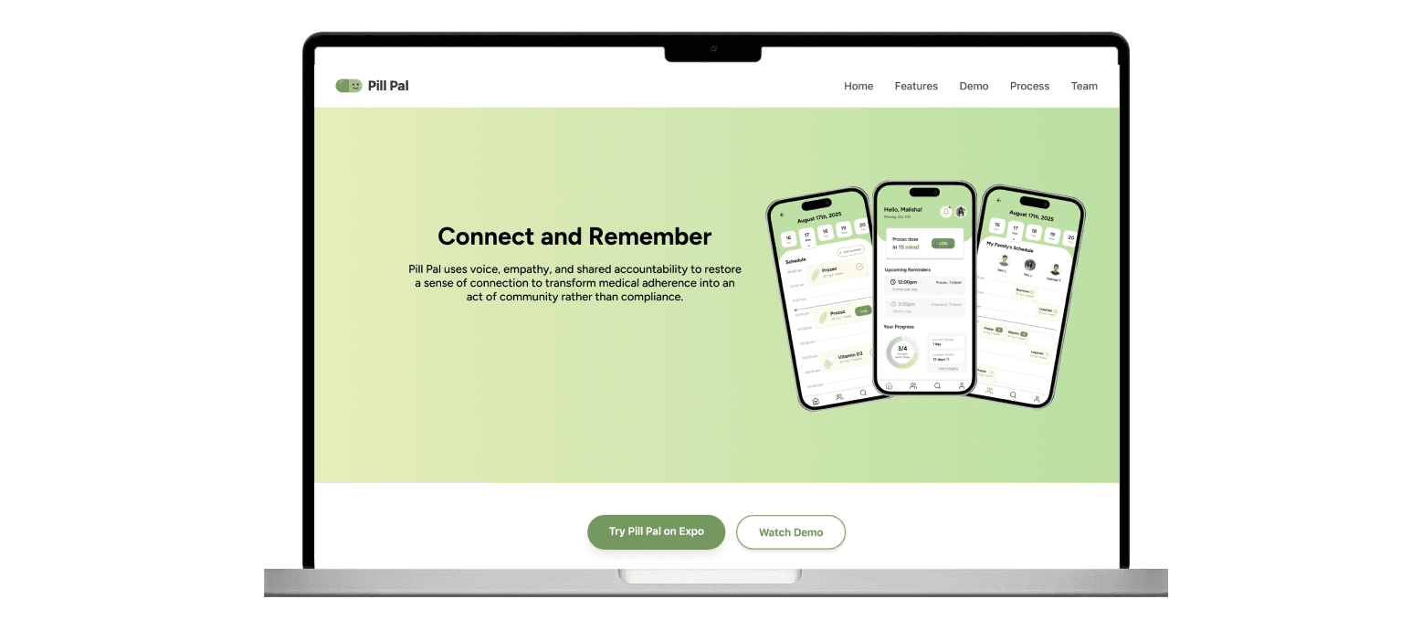 I led design and development for Pill Pal, a voice-enabled medication tracking app connecting patients with caregivers. With a focus on accessibility, I conducted user research, synthesized findings into empathy maps, POVs, and HMWs, and built the end-to-end experience — from wireframe sketches to a functional prototype in React Native and Next.js.