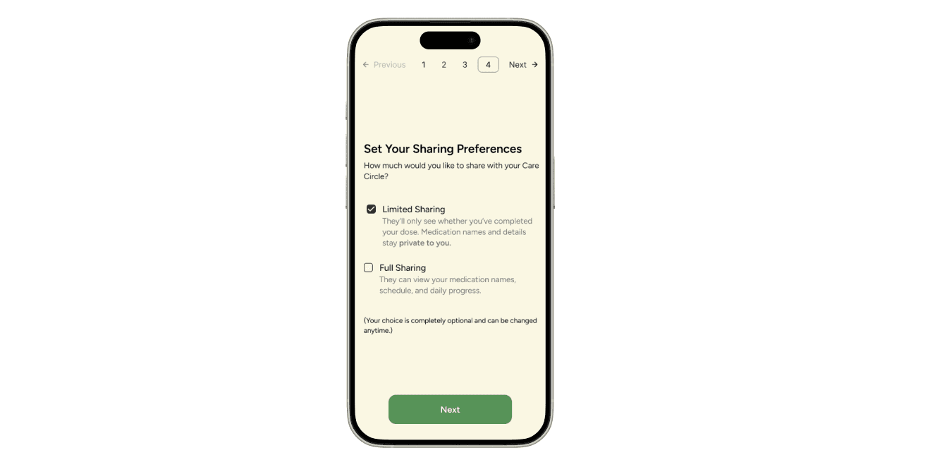 I addressed this by adding sharing preferences during onboarding and allow users to control exactly what medication data is visible. This improves both privacy and accessibility for those hesitant to share sensitive health information.