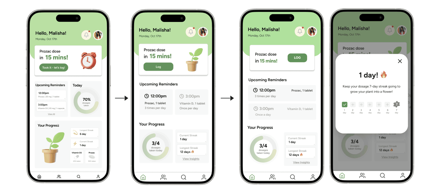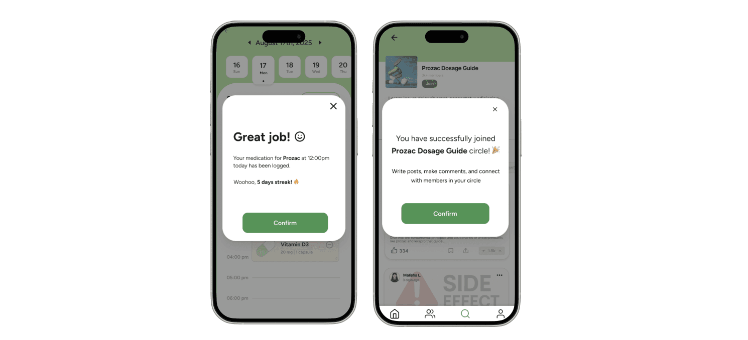 I designed these features to reinforce that medication adherence should not be an isolated experience and make users to feel community support by building a reliable support system around adherence.