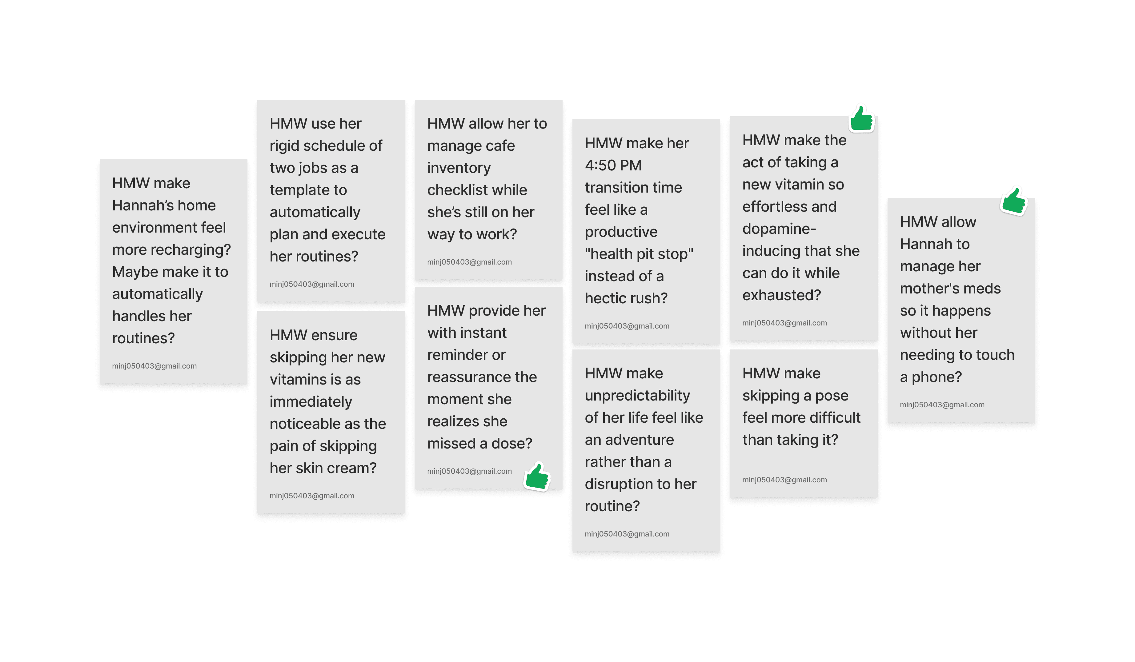 I brainstormed 10+ solutions per HMW and selected the top three to develop into experience prototypes: